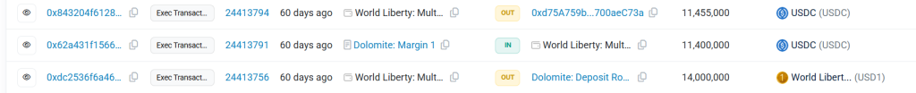 2 月 8 日,WLFI 財庫率先向 Dolomite 存入 1,400 萬枚 USD1(WLFI 自家發行的穩定幣) 作為抵押,借出了 1,140 萬枚 USDC。這筆錢在幾分鐘內就轉入了 Coinbase Prime。