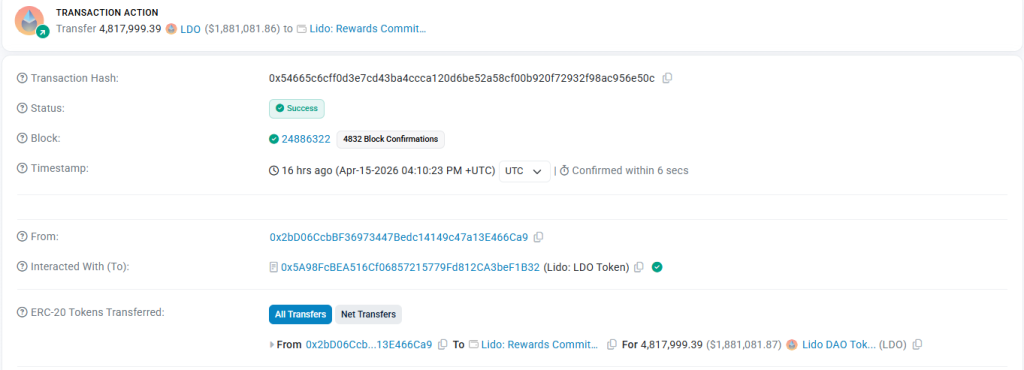 • 2026 年 4 月 16 日(凌晨): 執行錢包從做市商 Portofino 處接收 482 萬枚 LDO,顯示回購已進入實質交付階段。