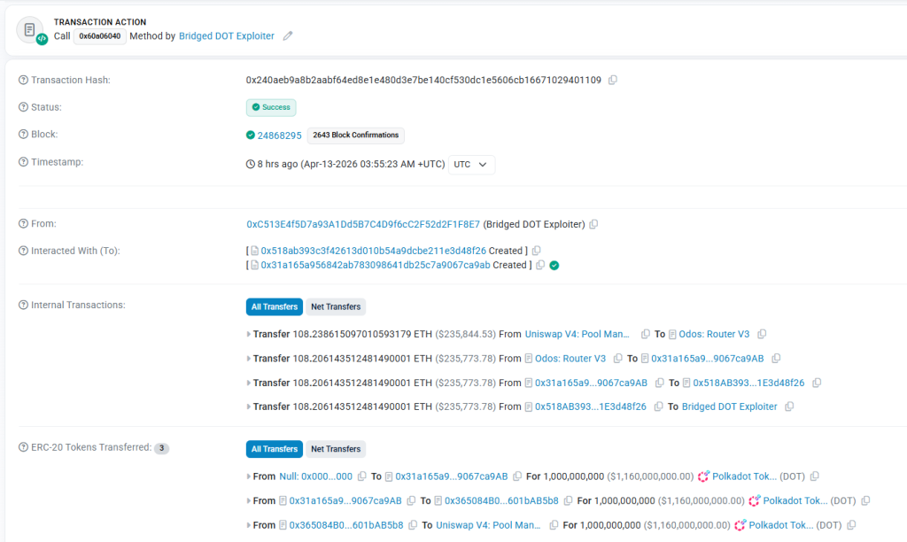 在取得權限後,攻擊者於單筆交易中鑄造了 10 億枚 $DOT。