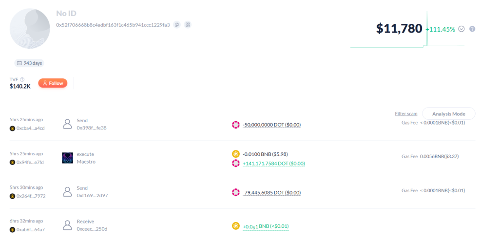 - 最終獲利: 最終將 50.3 萬枚 DOT 賣出,獲取 68.72 ETH,利潤達 15 萬美元。